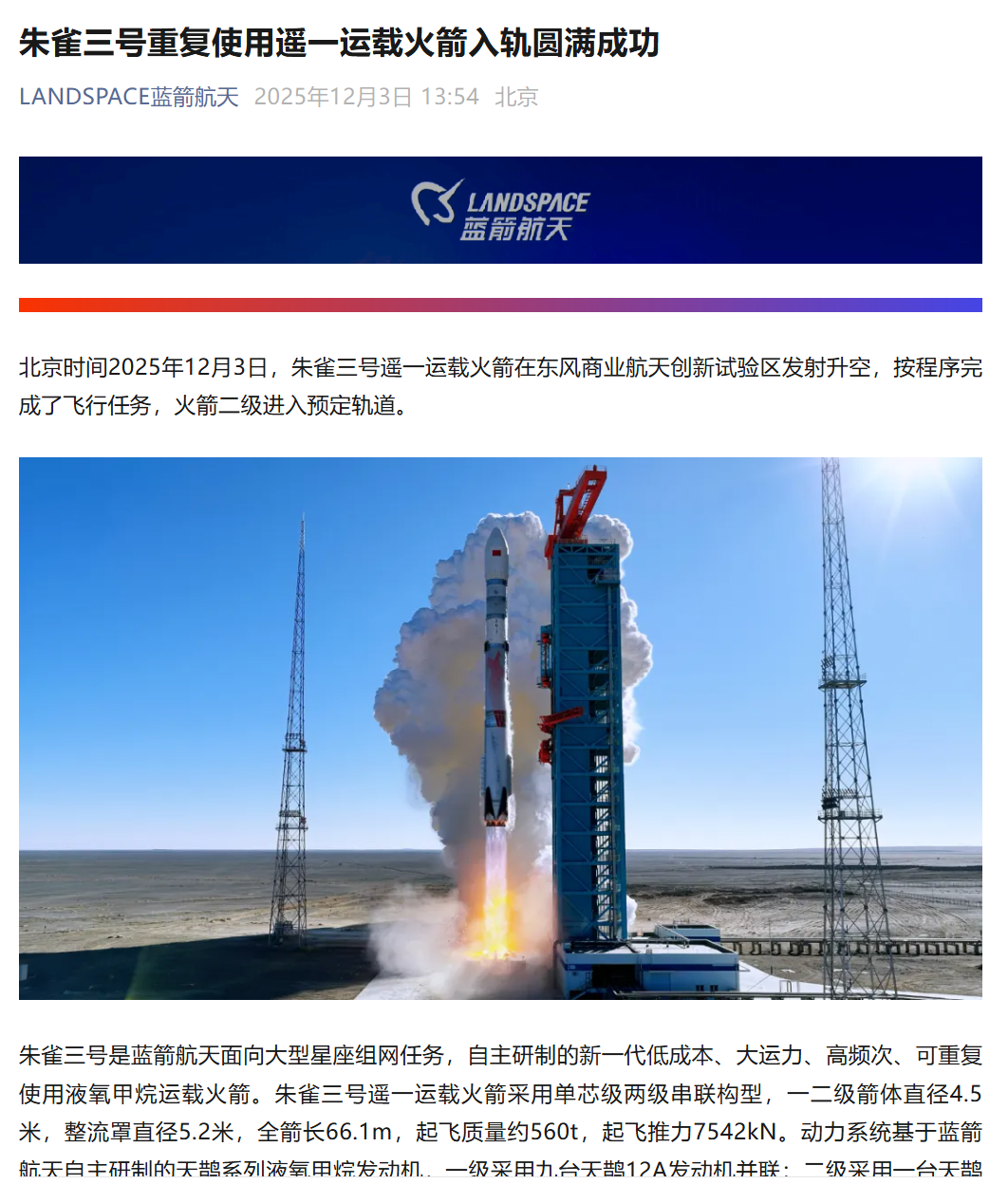 蓝箭航天发文表示,北京时间2025年12月3日,朱雀三号遥一运载火箭在东风商业航天创新试验区发射升空,按程序完成了飞行任务,火箭二级进入预定轨道。
