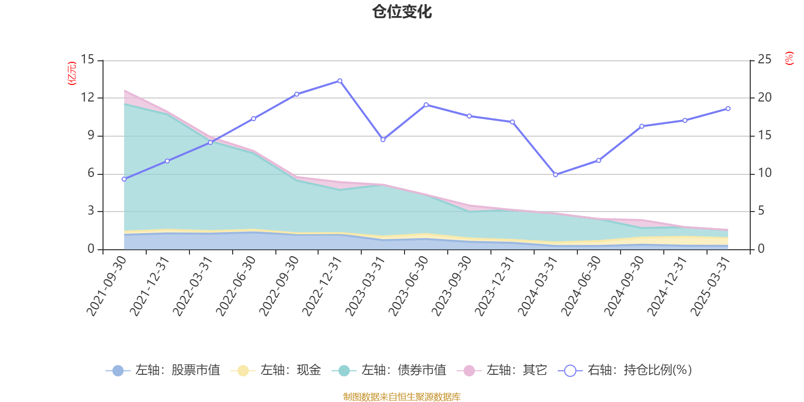 据定期报告数据统计,近三年平均股票仓位为16.82%,同类平均为18.87%。2022年末基金达到22.29%的最高仓位,2021年三季度末最低,为9.3%。