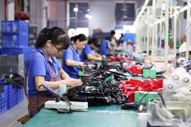 (中山的工人们正在进行产品组装,每天有几百单通过拼多多销往西部市场。受访者供图)