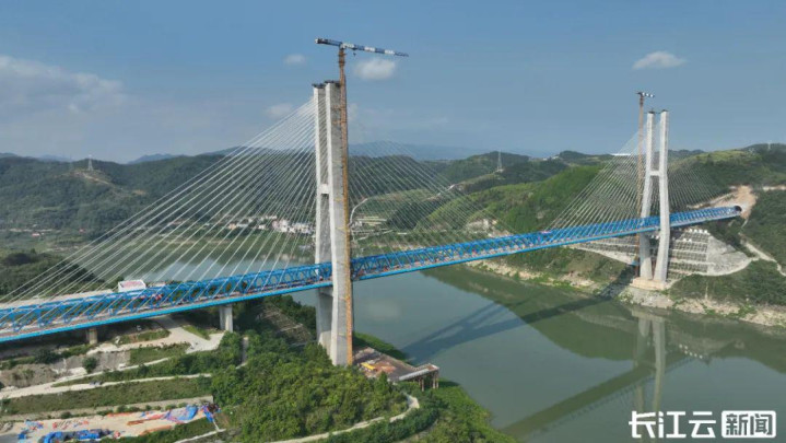 本次合龙的钢桁梁全长840米、宽11米、高9.4米,采用渐变三角桁式结构,最重桁节36.4吨,具有线形控制难度大、交叉施工作业多、吊装空间有限等特点。拼装施工前,项目建设者采用钢梁杆件散布、预压块堆载等措施,模拟实际主梁在杆件拼装过程中的线形,并建立全桥钢桁梁拼装BIM模型,结合场地布置、运输通道与吊装工况,对钢梁节段进行分类编号,做到“一件一号”,确保钢桁梁拼装有序、高效精准。