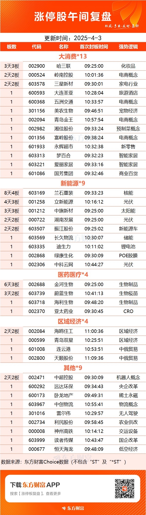 个股方面,大消费股集体走强,旅游、零售等方向表现活跃,哈三联3连板,永辉超市等涨停。物流、统一大市场概念股震荡走高,天顺股份涨停。下跌方面,高外销占比概念股集体重挫,巨星科技等多股跌停。