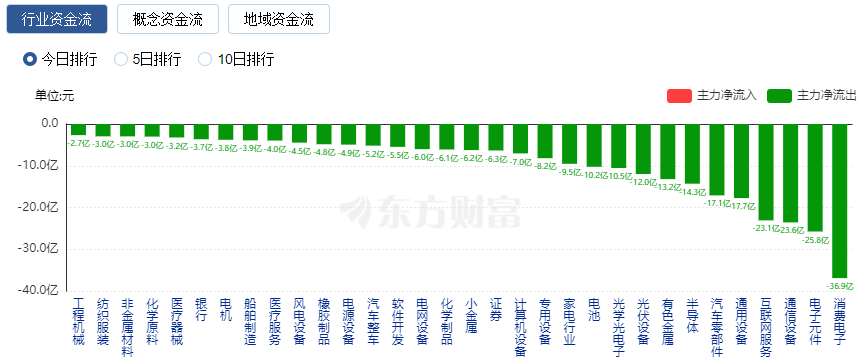 净流出方面,消费电子、电子元件等排名靠前,其中消费电子净流出36.9亿元。