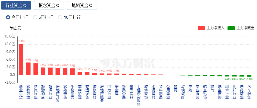 行业资金方面,截至午间收盘,商业百货、农牧饲渔等净流入排名靠前,其中商业百货净流入12.1亿元。