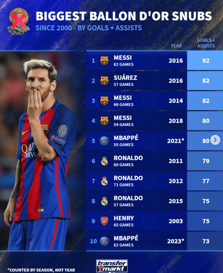 虎扑09月23日讯德转统计了21世纪以来,遗憾落选金球奖得主上个赛季或上个自然年参与进球数榜单。梅西和苏亚雷斯分别在2016年金球赛季直接参与92球和82球,却最终未能获得金球奖,最为遗憾。